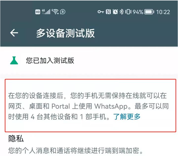 这意味着再也不用担心因为登录多台设备而增加封号风险。毕竟我们跨界的人的WhatsApp基本都是客服号,人交接或者离职的时候切换设备是很正常的。四个设备同时使用也便于协同沟通,方便工作人员轮换与客户沟通。